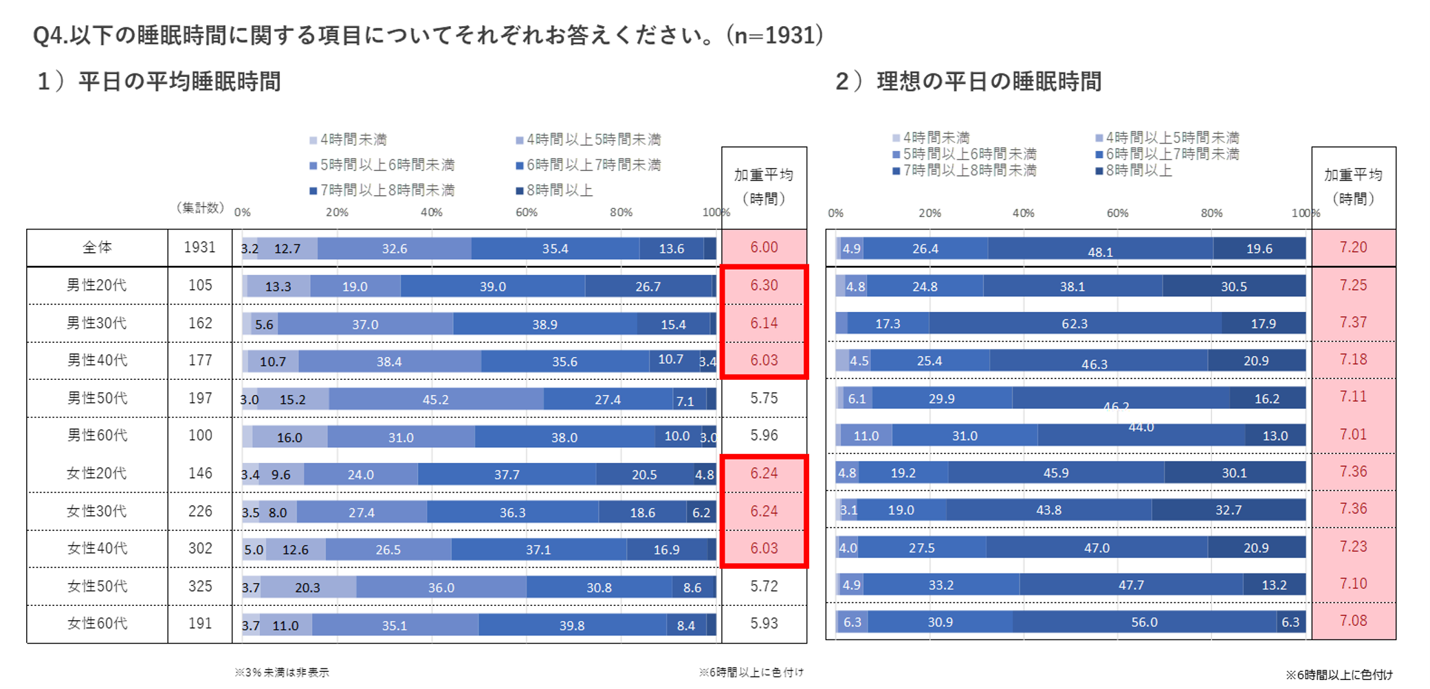 「睡眠」カテゴリ顕在層に平日の平均睡眠時間を聞いたところ、約6時間にとどまり、理想とする7時間以上の睡眠には、全世代で1時間以上不足していることが明らかになりました。