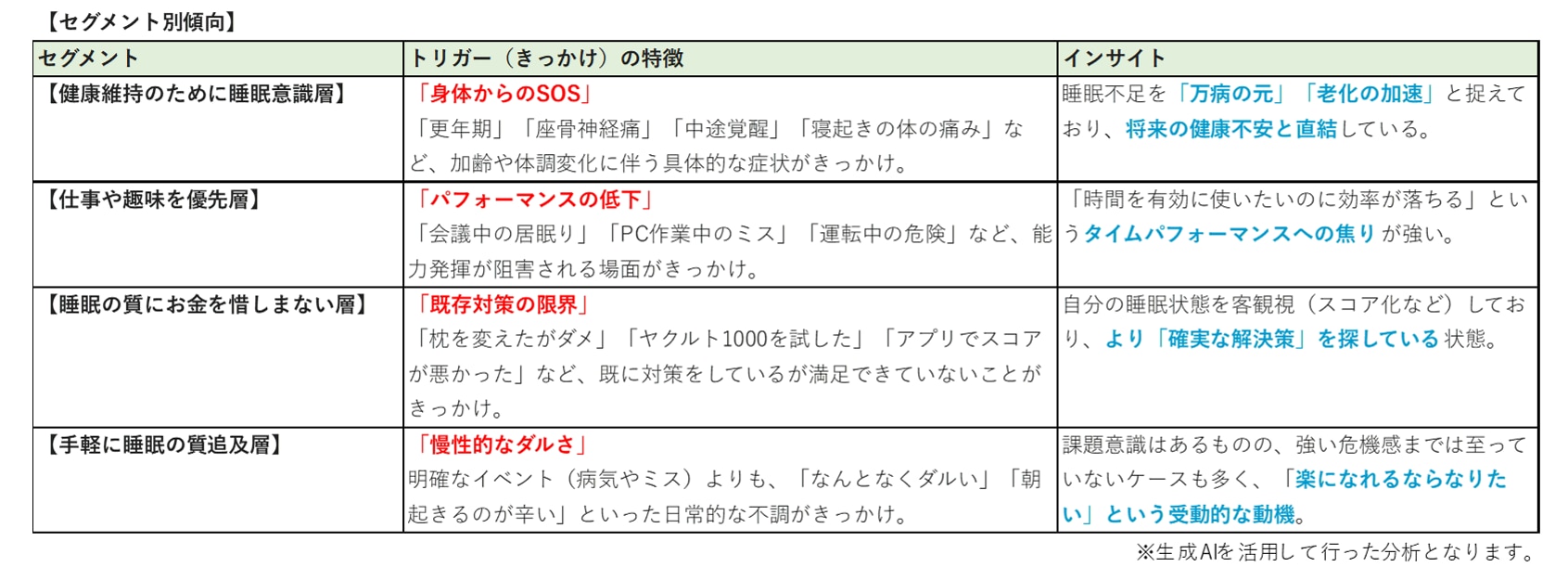 セグメント別にも特徴が出ており、特に【手軽に睡眠の質追及層】では、「慢性的なダルさ」があるにも関わらず、積極的に改善したい欲求というよりも、「楽になれるならなりたい」といった受動的なインサイトがみられました。