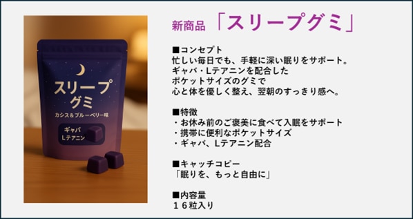 次に、睡眠の質改善を目的とした、睡眠改善グミの商品コンセプトシートを提示し、反応を見てみました。(※商品・コンセプトシートは生成AIを活用して作成した架空のものです。)