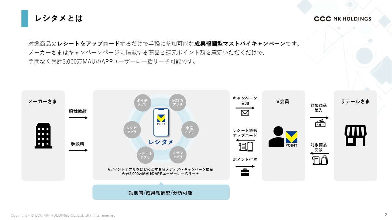 レシタメとは、対象商品のレシートをアップロードするだけで手軽に参加可能な成果報酬型マストバイキャンペーンです。メーカーさまはキャンペーンページに掲載する商品と還元ポイント額を策定いただくだけで、手間なく累計3,000万MAUのAPPユーザーに一括リーチ可能です。