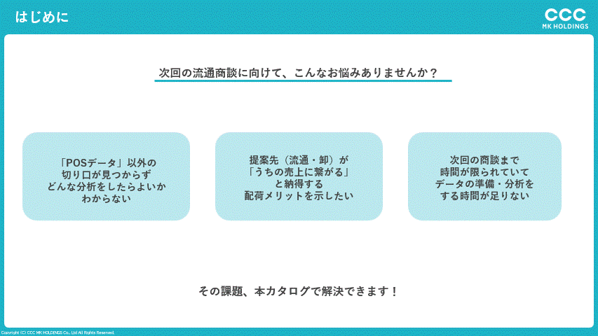 春夏の棚割り提案に向けて商談準備をされる方も多いと思います。そのためには事前にデータを整理したうえで、準備を進めるのが効果的です。今回ご紹介するパッケージでは、提案に役立つ分析メニューを特別価格でお試しいただけます!