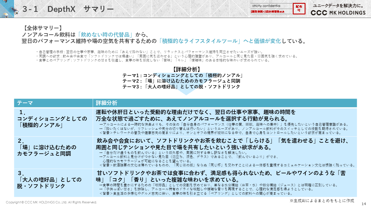 若年層を中心としたアルコール離れなどにより、カテゴリが急激に増えている「ノンアルコール飲料」。本資料では、飲用シーンの実態やニーズの深掘りした結果がまとめられています。「ノンアルコールを飲用したいシーン・ノンアルコール飲料へのニーズ マインドマップ」など、コラムには記載がない詳しい分析結果も掲載されています。